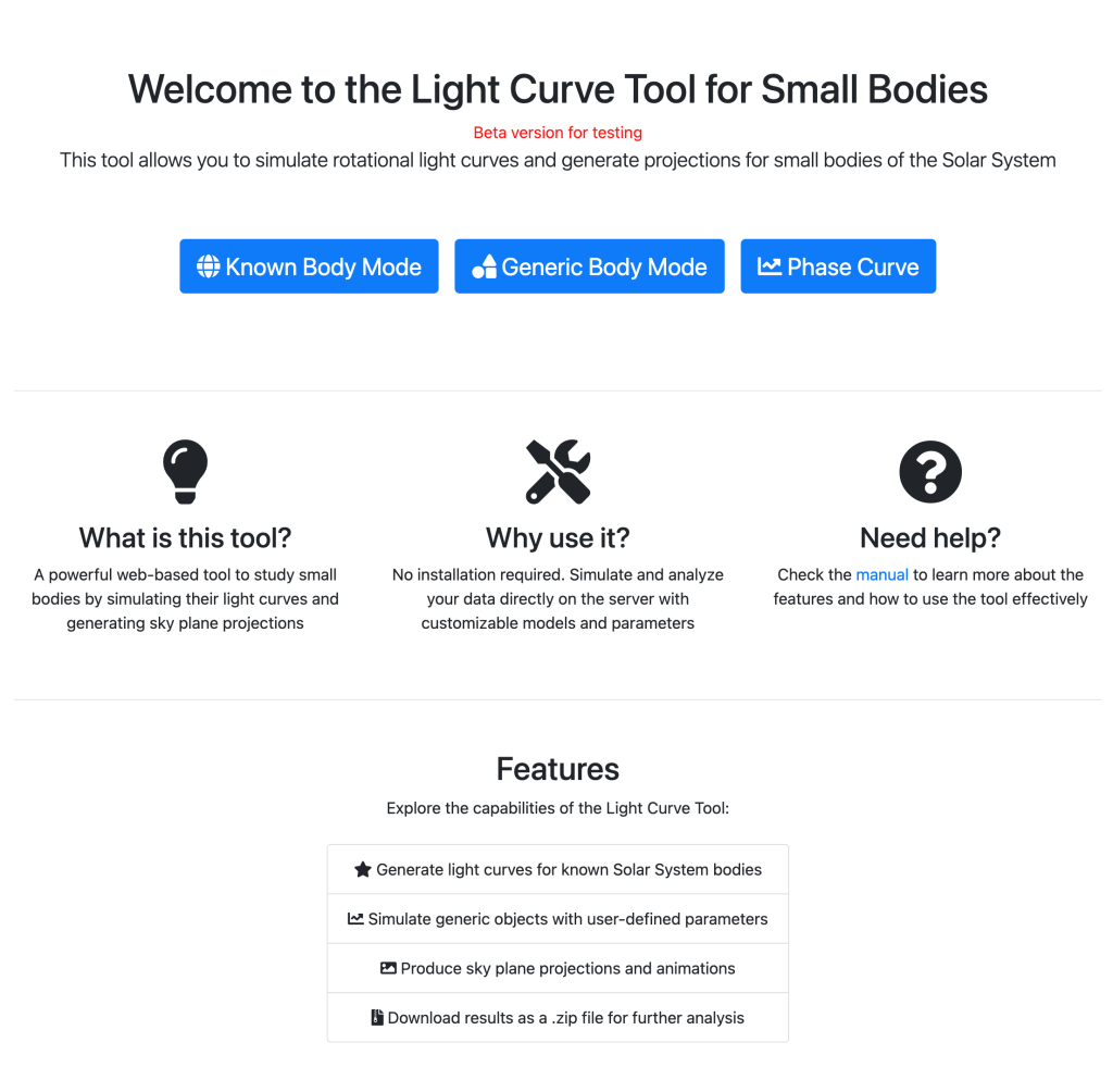 Juan Luis Rizos offers the Solar System community a simulator for modeling the light curves of small bodies. This software is designed to analyze the brightness variations of rotating celestial objects, supporting both simple and complex rotation modes. Whether the object is spherical, ellipsoidal, or defined by custom shape files, the simulator provides a high level of precision. Unlike many other tools, it focuses on generating magnitude curves rather than radiance, making it particularly valuable for astronomical research where accurate light measurements are essential.