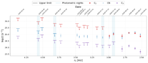 Using the CAFOS instrument at Calar Alto Observatory (Spain), our team obtains red-band images to study the dust environment and visible spectra to measure gas emissions from species such as CN, C₂, and C₃. This combination provides a comprehensive picture of the comet’s activity. Preliminary results indicate that gas activity in E1 was already present at large distances from the Sun, with clear detections of CN at 3.73 AU, C₂(3 AU), and C₃(2.8 AU). CN and C₂ show similar production rates, while C₃ is about ten times lower. A drop in activity observed at 2.5 AU in early September, visible in the figure below, could be related to rotational effects, as different regions of the nucleus may be more or less active. This pattern is still under investigation and will be further assessed with upcoming observations.