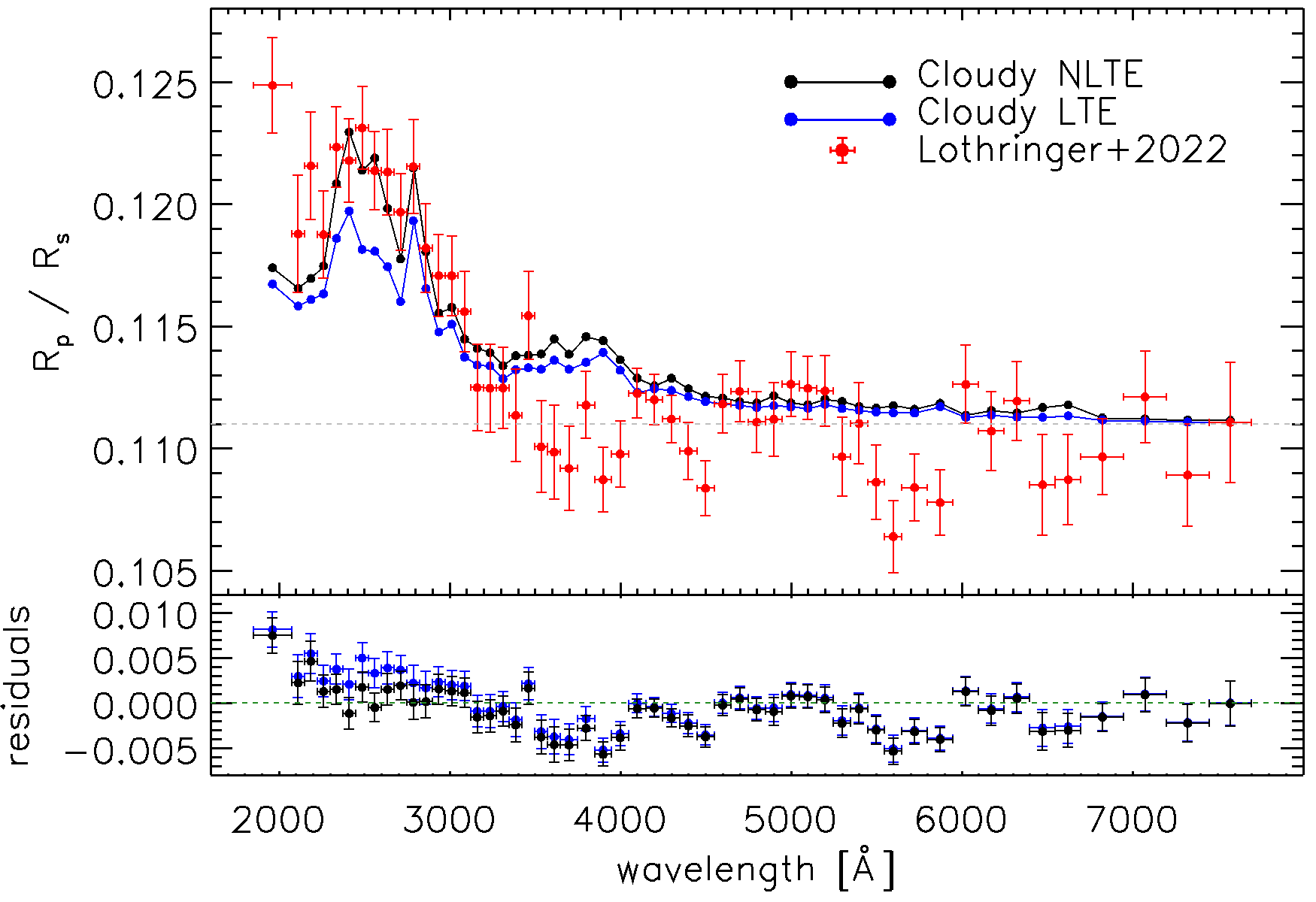 Comparison of the NLTE (black) and LTE (blue) theoretical transmission spectra with the HST WFC3/UVIS observations published by Lothringer et al. 2022. The horizontal error bars shown for the red points correspond to the size of the wavelength bins. The bottom panel shows the residuals between the observation and each of the models, with a green dashed line at zero for reference.