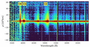 Spectral observations also revealed that gas production was relatively low compared to other JFC comets. The following figure shows the optical fluorescent emission of some radicals in the coma of comet 7P on May 13. The nucleus is placed at 𝜌 = 0 km, the –y axis is the antisun direction, and the +y axis is the Sun direction. We can see CN and C₂ fluorescent emissions display asymmetries between the directions probed by the long-slit spectrophotometric observations:
