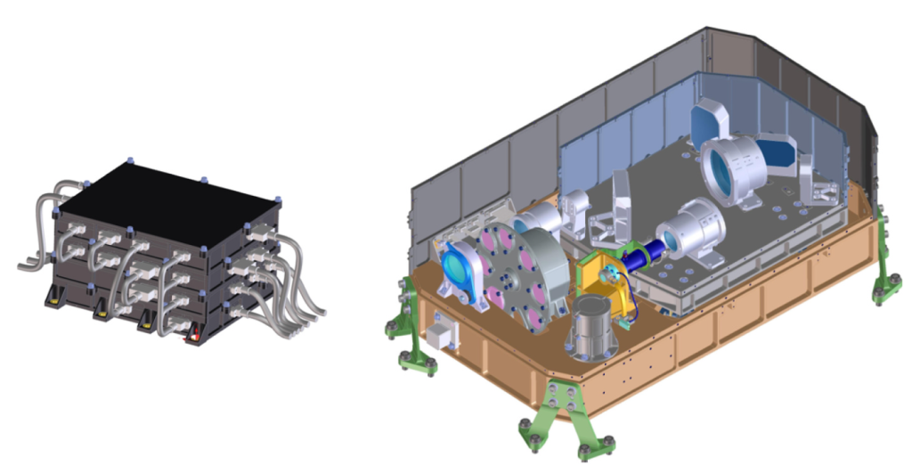 3D drawings of the electronic box (left) and the optical bench (right). Extracted from the paper.