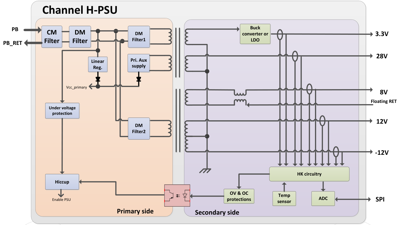 A regulated +8V voltage is produced for the detector proximity electronics, while a +3.3V output, which has stricter ripple and noise requirements, is regulated by a synchronous buck converter. Additionally, regulated +24V and ±12V secondary outputs are included. The design incorporates undervoltage protection on primary circuits to prevent premature startup, and all secondary outputs feature over-current and over-voltage protection. These protections are linked to a hiccup circuit for safe resets of the power supply. Output currents, voltages, and temperature are monitored and transmitted to the PROC-board via SPI-bus.